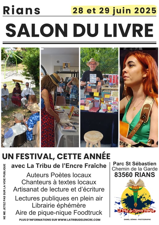 Nous comptons sur vous tous pour venir découvrir ce salon du livre nouvelle formule et aussi pour participer à sa promotion et à son développement, le 28 et 29 juin au parc Saint Sébastien de Rians - Chemin de la Garde (à côté du stade et face à l'école primaire) de 10h à 19h.